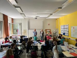 Bildunterschrift Foto 1: Janina Risse von den Stadtwerken Ostmünsterland sowie Jutta Müller-Knipping von der Energieversorgung Beckum überreichen Schlüsselbänder an die Lehrerin Frau Natalie Wagner samt Schülerinnen und Schüler der 5. Klasse der Gesamtschule Ennigerloh-Neubeckum, Standort Ennigerloh.