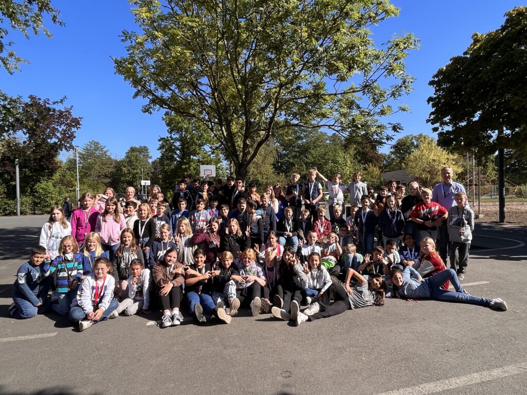 Bildunterschrift Foto 1: Janina Risse von den Stadtwerken Ostmünsterland sowie Jutta Müller-Knipping von der Energieversorgung Beckum überreichen Schlüsselbänder an die Lehrerin Frau Natalie Wagner samt Schülerinnen und Schüler der 5. Klasse der Gesamtschule Ennigerloh-Neubeckum, Standort Ennigerloh.