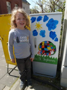 Kinder der Kita St. Stephanus bemalen Stromkasten in der Clemens-August-Straße – evb stellt Materialien – Kinderbuchfigur „Elmar“ symbolisiert bunte Gesellschaft