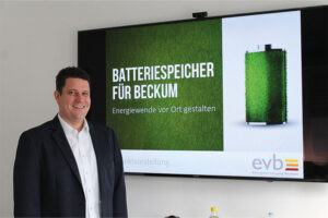 Beckum. Strom aus erneuerbaren Quellen ist ein wichtiges Standbein der Energiezukunft. Jedoch scheint die Sonne und weht der Wind nicht immer dann, wenn gerade viel Strom gebraucht wird. Energiespeicher tragen dazu bei, die produzierte Energie optimal zu nutzen. Die Energieversorgung Beckum (evb) plant den Bau eines Batteriespeichers. Der Speicher kann rein rechnerisch ganz Beckum für sechs Stunden mit Strom versorgen. „Erneuerbare Energien können nur in Kombination mit Speichermöglichkeiten ihr Potenzial entfalten. Deshalb ist dieses Speicherprojekt ein Meilenstein für die Energiewende Beckums. Es ist die größte Investition in der Geschichte der evb“, sagt Dr. Daniel Dierich, Geschäftsführer der evb.