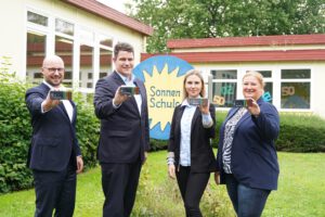 Auf dem Bild zu sehen von links: Bürgermeister Michael Gerdhenrich, Dr. Daniel Dierich, evb-Geschäftsführer, Jacqueline Kersting, Projektkoordination und Claudia Sander-Braunert, Schulleiterin der Sonnenschule, Beckum.