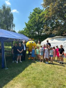 Bildunterschrift: Hand in Hand haben die Energieversorgung Beckum (evb) das Maskottchen Eddie, Carina Rösler und Propst Rainer Irmgedruth die Spende überreicht. Neben Maskottchen Eddie links: Propst Rainer Irmgedruth, und rechts: Carina Rösler, Finanzbuchhaltung evb Mit auf dem Foto sind die Teilnehmer des Zeltlagers.(Foto: Energieversorgung Beckum, zum Abdruck frei)