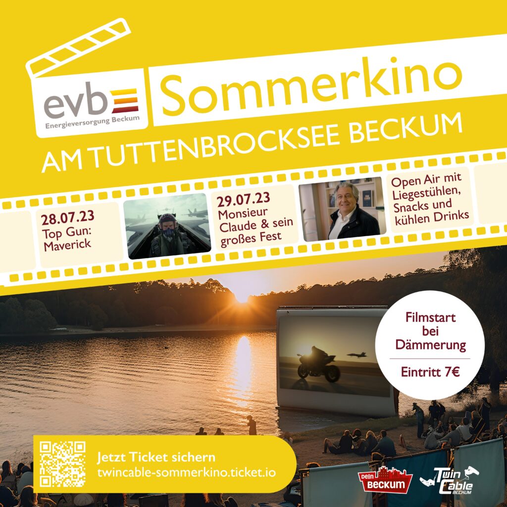 Kühle Getränke, Snacks, bequeme Liegestühle und zwei Film-Highlights warten am 28. und 29. Juli auf die Besucher des Sommerkinos am Tuttenbrocksee Beckum. Hauptsponsor ist die Energieversorgung Beckum (evb). Der Ticket-Vorverkauf durch TwinCable hat jetzt am 29. Juni 2023 begonnen. „Als regionales Versorgungsunternehmen ist es uns wichtig, Veranstaltungen wie das Sommerkino zu unterstützen. Sie tragen maßgeblich zur Lebensqualität in Beckum bei“, sagt Jutta Müller-Knipping, Pressesprecherin bei der evb, und fügt hinzu: „Wir freuen uns, dass die Karten dank unseres Sponsorings zu einem guten Preis angeboten werden können.“ Ziel des Open-Air Kinos ist es, ein breites Publikum und Zuschauer jeder Altersklasse anzusprechen. Die beiden ausgewählten Filme sind Publikumslieblinge und bieten Unterhaltung für jeden Geschmack. Am 28. Juli sorgt Tom Cruise mit dem Actionfilm „Top Gun: Maverick“ für Spannung auf der großen Leinwand am Tuttenbrocksee. Spaß und Gelächter sind am 29. Juli mit der französischen Komödie „Monsieur Claude und sein großes Fest“ vorprogrammiert. Die Filme starten an beiden Abenden jeweils mit Einbruch der Dämmerung gegen 22 Uhr.