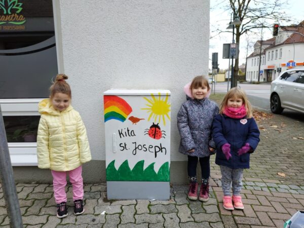 „Wir haben den Stromkasten unter dem Motto ‚Zusammenhalt‘ angemalt. In dieser schweren Zeit ist Zusammenhalt besonders wichtig und auch Motto für unsere Kita. Wir sind im August in unsere neuen Räumlichkeiten gezogen und mussten uns erst wieder neu finden, freuen uns aber nun umso mehr über die schöne Kita“ so Frau Christina Westhagemann, Leitung der Kita St. Joseph.