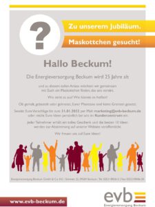Die Energieversorgung Beckum wird 25 Jahre alt und zu diesem tollen Anlass möchten wir gemeinsam mit Euch ein Maskottchen finden, das uns vereint. Wie sieht es aus? Wie könnte es heißen? Ob gemalt, gebastelt oder geknetet, Eurer Phantasie sind keine Grenzen gesetzt.