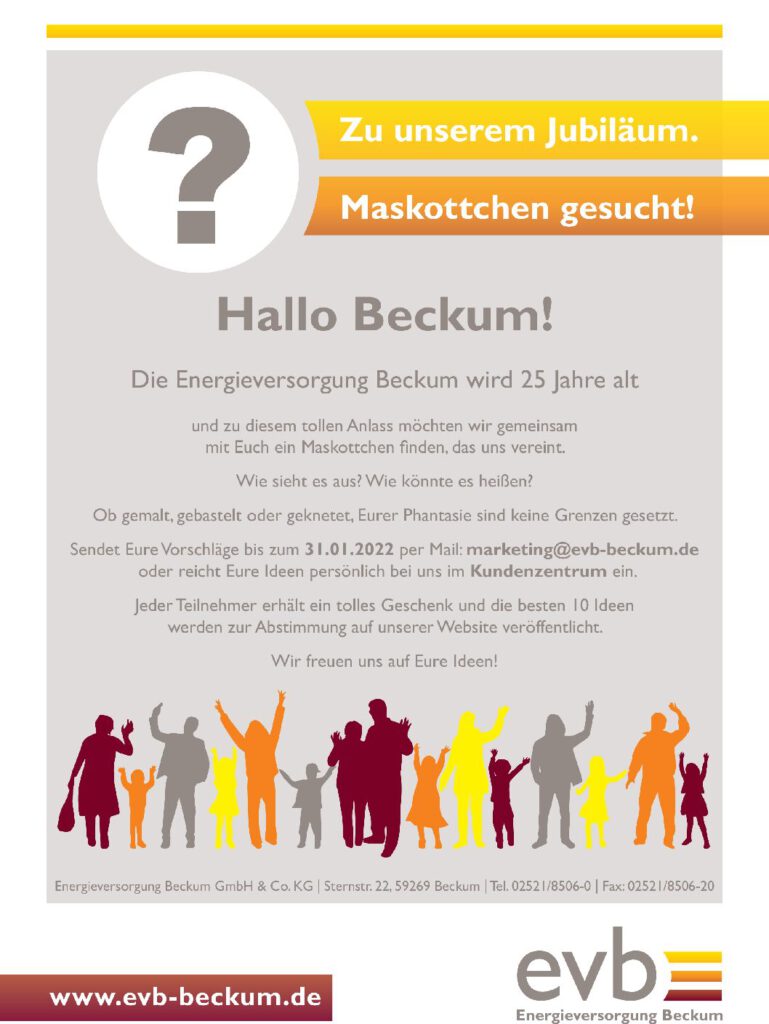 Sendet Eure Vorschläge bis zum 31.01.2022 per Mail: marketing@evb-beckum.de oder reicht Eure Ideen persönlich bei uns im Kundenzentrum ein. Jeder Teilnehmer erhält ein tolles Geschenk und die besten 10 Ideen werden zur Abstimmung auf unserer Website veröffentlicht.
