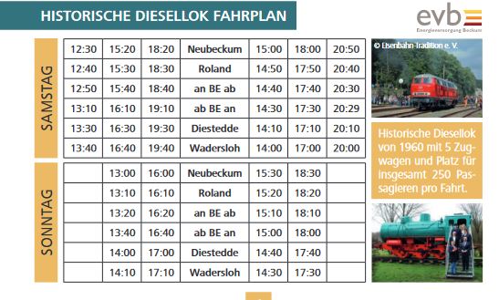 „Damals gab es bei der Eisenbahn noch drei Wagenklassen, darunter die preiswerte 3. Klasse mit ihren Holzbänken, die unseren Eltern und Großeltern sicher in bester Erinnerung geblieben ist. Genau dieses Reisegefühl möchten wir unseren kleinen und großen Fahrgästen gern auf der Fahrt vermitteln.“ Die Fahrkarten können direkt vor Ort im Zug erworben werden. Grundsätzlich sind die Fahrten für Kinder kostenlos, Erwachsene zahlen fünf Euro. Weitere Informationen zum Fahrplan und zum Stadtjubiläum unter www.beckum.800.de