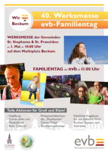 Beckum. Bei frühlingshaftem Wetter hat am 1. Mai die Familienfeier der Energieversorgung Beckum (evb) stattgefunden. Mit rund 1500 Besucherinnen und Besuchern herrschte den ganzen Tag über reges Treiben auf dem Beckumer Marktplatz, wo die evb ein vielfältiges Programm auf die Beine gestellt hatte.