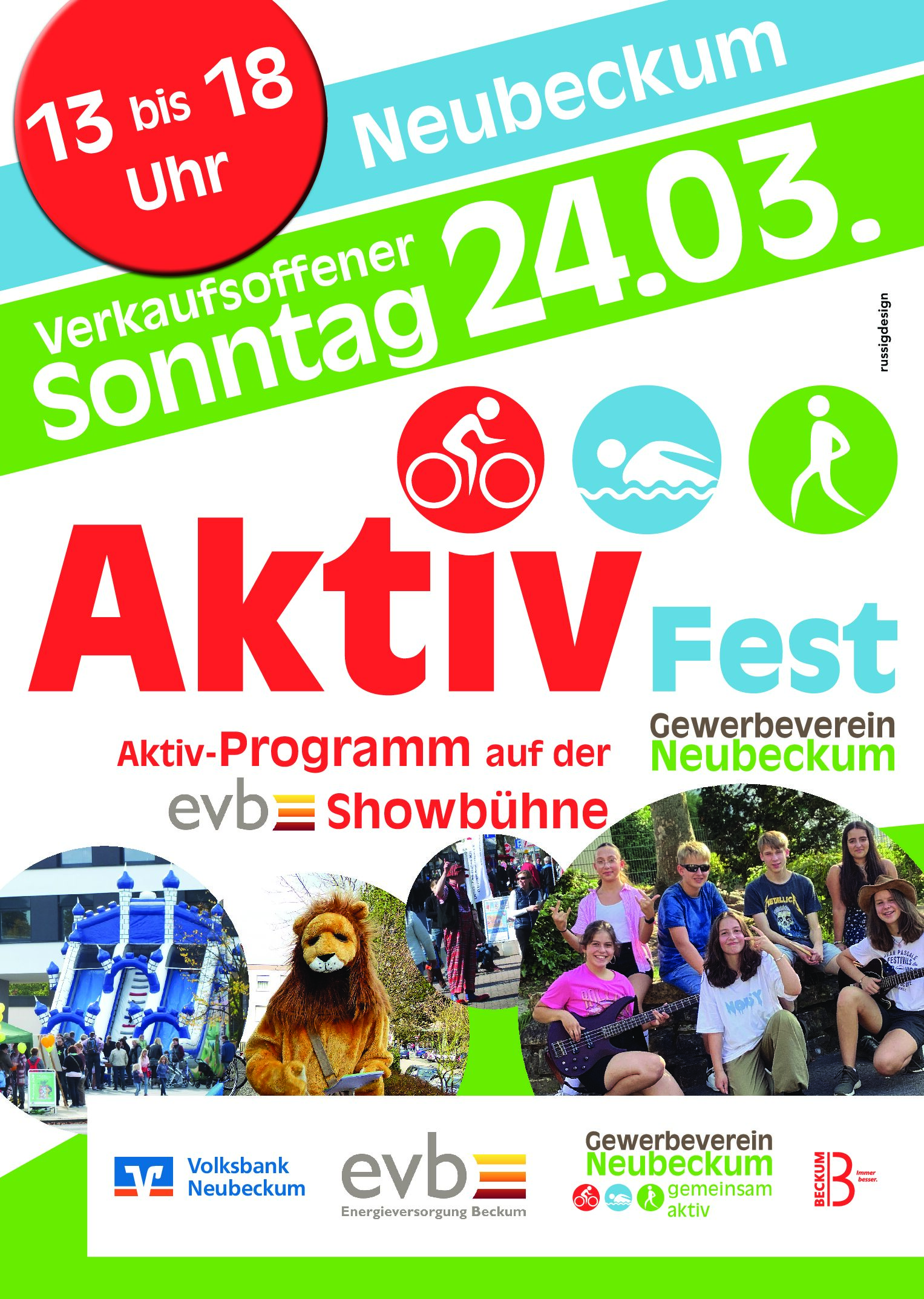Am 24. März 2024 findet zum zehnten Mal das Aktiv-Fest von Neubeckum statt. Von 13 bis 18 Uhr haben die Geschäfte geöffnet. Zusätzlich warten spannende Attraktionen und interessante Angebote entlang der Hauptstraße auf die Besucher. Mit dem bunten Aktiv-Programm auf der großen evb-Showbühne erleben alle Gäste einen unterhaltsamen und unvergesslichen Sonntag in Neubeckum.
